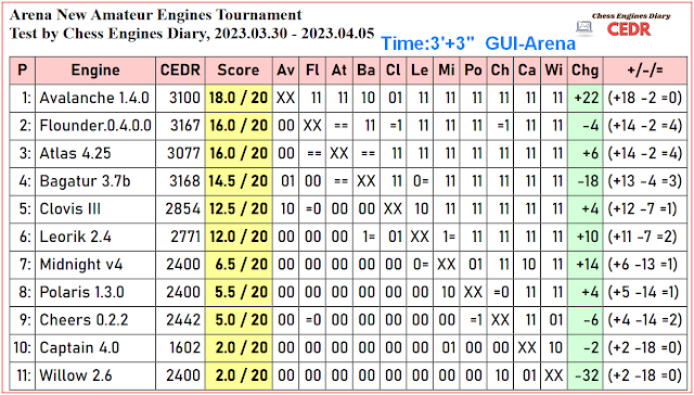 Avalanche 1.4.0 wins Arena New Amateur Engines Tournament (Test by Chess Engines Diary, 2023.03.30 - 2023.04.05)