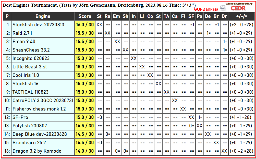 Stockfish dev-20230813 wins Best Engines Tournament, (Tests by Jörn Gronemann, Breitenburg, 2023.08.16 Time: 3'+3")