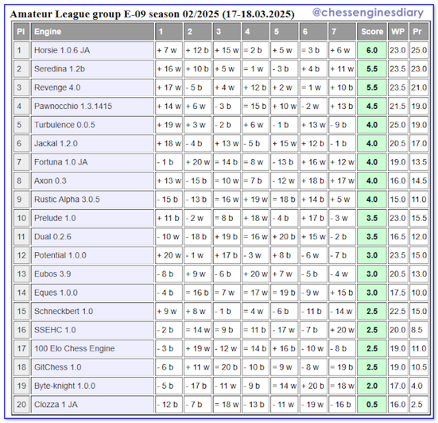 This is the penultimate group, E-09, of the Amateur Chess Engine League. The winner was the Horsie 1.0.6 JA engine, second place went to the Seredina 1.2b engine, third to Revenge 4.0, and fourth to Pawnocchio 1.3.1415. These four engines advanced to group E-08. More results will be available on the website soon.