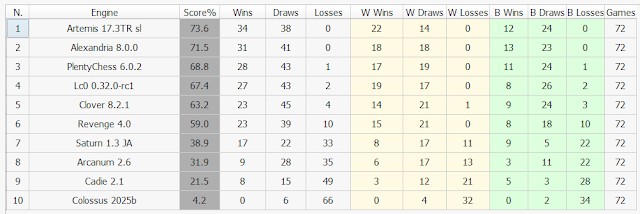 | 10: | Colossus 2025b | 2833 | 3.0 / 72 | 102.00 | -72 | (+0 -66 =6) |